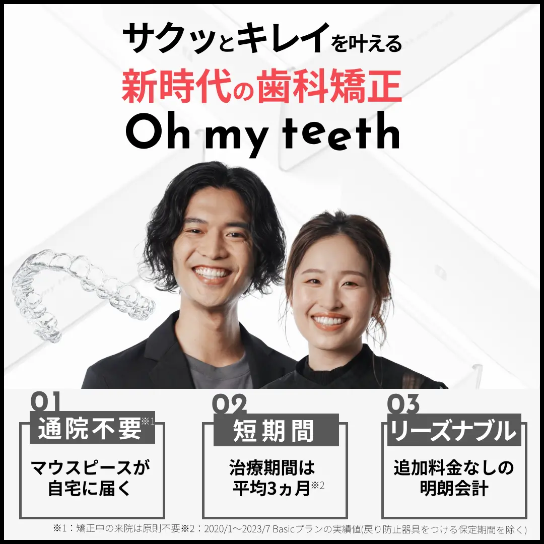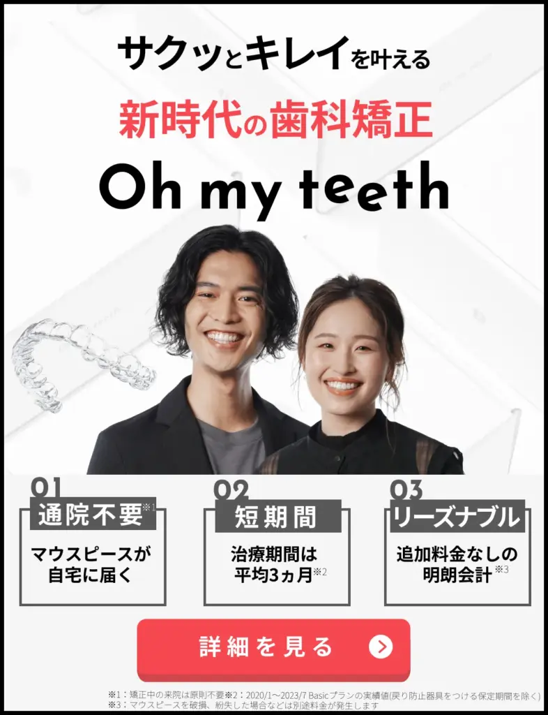 さらに、もしOh my teethで治療できない場合は他の矯正方法を提案してくれるため、矯正治療を考えている方すべてにオススメです。